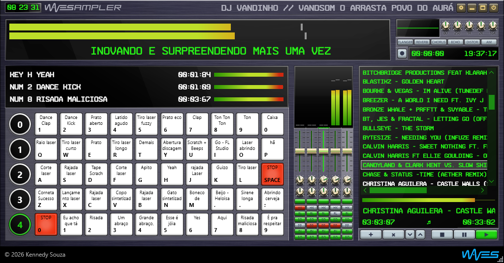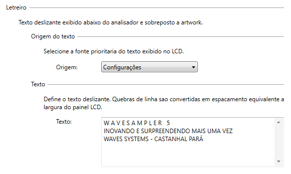 O letreiro do LCD, também chamado de Texto Rolante ou Marquee, é a faixa de texto exibida na parte inferior do painel principal. Ele serve para mostrar mensagens fixas, slogans, identificação do setup, avisos visuais ou qualquer outro conteúdo curto que precise permanecer em movimento contínuo na interface. Diferente da artwork, que funciona como fundo estático, o letreiro é um elemento dinâmico: ele percorre horizontalmente o LCD e pode conviver com a artwork e com o analisador, ajudando a enriquecer a apresentação visual sem ocupar a área central do painel.